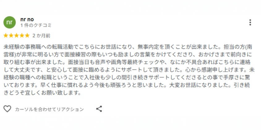 大手企業のような数の多さではなく、1人ひとりに寄り添う丁寧なサポートで口コミ・評判を集めています。